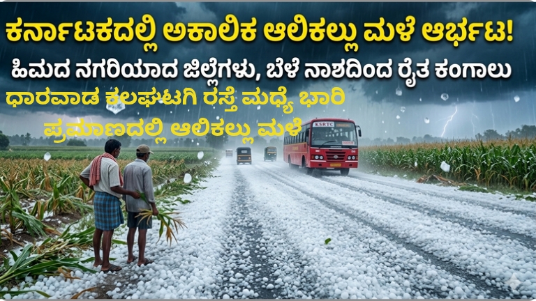 ಕರ್ನಾಟಕ ಆಲಿಕಲ್ಲು ಮಳೆ: ಕರ್ನಾಟಕದ ಹಲವು ಜಿಲ್ಲೆಗಳಲ್ಲಿ ಕಳೆದ ಕೆಲವು ದಿನಗಳಿಂದ ಬಿಸಿಲಿನ ಬೇಗೆ ವಿಪರೀತವಾಗಿತ್ತು. ಆದರೆ, ಹಠಾತ್ತನೆ ಬದಲಾದ ವಾತಾವರಣದಿಂದಾಗಿ ರಾಜ್ಯದ ವಿವಿಧೆಡೆ ಅಕಾಲಿಕ ಮಳೆ (Unseasonal Rain) ಆರಂಭವಾಗಿದೆ. ಸೋಮವಾರ ಮಧ್ಯಾಹ್ನ ಮತ್ತು ಸಂಜೆ ವೇಳೆಗೆ ಹುಬ್ಬಳ್ಳಿ, ಧಾರವಾಡ, ಚಾಮರಾಜನಗರ ಸೇರಿದಂತೆ ಉತ್ತರ ಮತ್ತು ದಕ್ಷಿಣ ಕರ್ನಾಟಕದ ಹಲವು ಭಾಗಗಳಲ್ಲಿ ಗುಡುಗು ಸಹಿತ ಭಾರಿ ಆಲಿಕಲ್ಲು ಮಳೆ (Hailstorm) ಸುರಿದಿದೆ. ಈ ಮಳೆ ಒಂದು ಕಡೆ ಜನರಿಗೆ ತಂಪು ನೀಡಿದ್ದರೆ, ಇನ್ನೊಂದೆಡೆ ರೈತರ ಬದುಕನ್ನು ಬೀದಿಗೆ ತಂದಿದೆ. ರಸ್ತೆಗಳ ಮೇಲೆ ಹಿಮದಂತೆ ಆಲಿಕಲ್ಲುಗಳು ರಾಶಿ ಬಿದ್ದಿರುವ ದೃಶ್ಯಗಳು ಸಾಮಾಜಿಕ ಜಾಲತಾಣಗಳಲ್ಲಿ ವೈರಲ್ ಆಗುತ್ತಿವೆ.